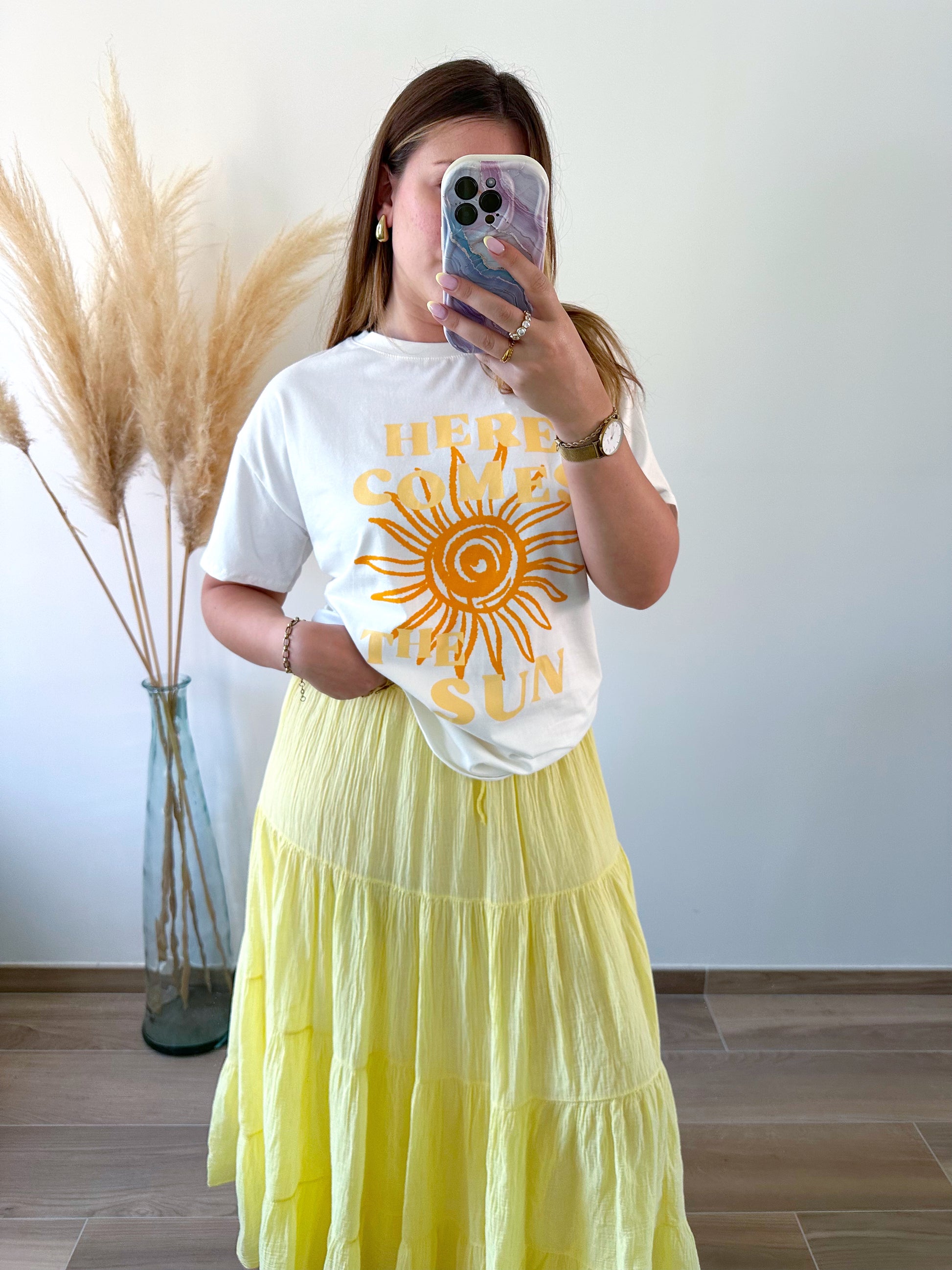 ▫️Tee-shirt blanc imprimé "HERE COMES THE SUN" multicolore